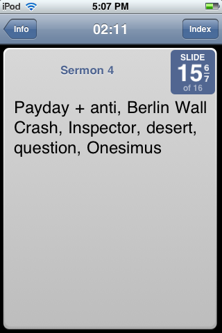 I do have a feature I’d like added, the ability to start/stop/reset the time during the presention without having to go back the information screen (this would be great for big events with multiple speakers, as well as a great timer for pastors). Other than than, if you use Keynote and have an iPhone or Touch – you have to get Stage Hand. It just rocks.