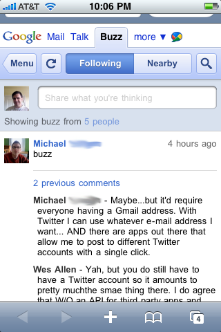 I didn’t have access to Buzz in my regular gmail account until late this morning, and if that had been my first encounter with Buzz I’d have to echo my friend Michael’s first buzz update, “i’m sorry, but this won’t replace FB.” Buzz in gmail is easy to use and update, but it does seem to be nothing more than the aforementioned illicit child of facebook and twitter. Buzz’s potential simply doesn’t show up there. On the mobile, however, the potential suddenly appears by the ability to access location-based information. I find this fascinating. Google Buzz manages to travel on the path that Twitter paved, but instead of utilizing text messages they’ve created a rich web-app that harnesses HTML 5. An app that seems to give a better experience than it’s desktop based cousin! Let me show you why I say this. On the right is the main buzz app window when you access I access it on my iPhone. It’s very straight forward – see Buzz updates from people I have asked to follow, along with comments on those updates (which is very “Facebook like”). Notice, however, the “nearby” button at the top of the screen. Here’s what it looks like when you select it.