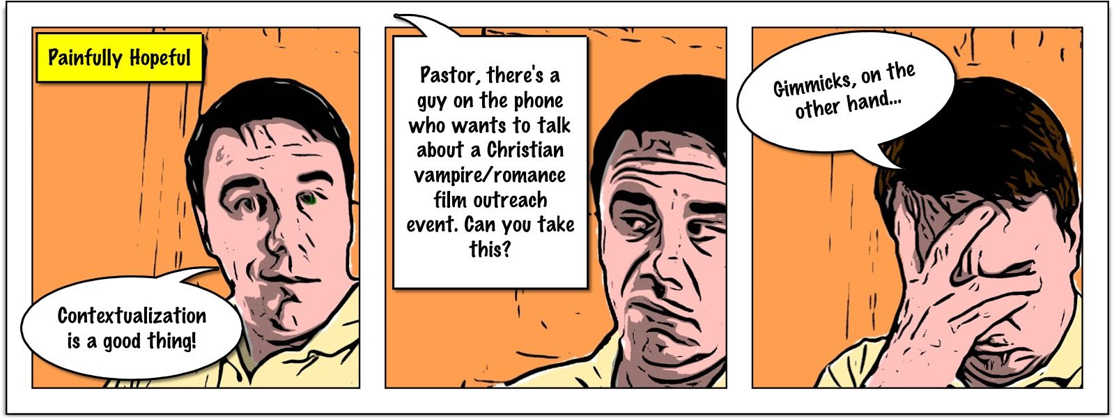 No, I didn’t actually get this call, but I’ve gotten some close to it! This strip sprang from a recent youth ministry event I attended where I felt the presenter kept using the word “contextual” but it kept on meaning “gimmick.”