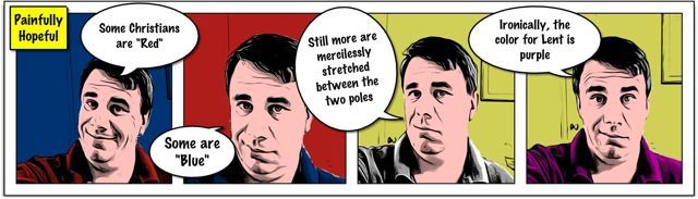 I have Christian friends from all over the political spectrum. Most are happy to discuss differences and respect each other, some are more interested in making sure people know that they are right. The reality is that we have much to learn from each other in the tension between our beliefs of what the world should be, and God’s. This brings me back to Jesus in the wilderness who, when stretched between the designs common to this world and his Father’s will, managed to resist temptation. We’re all called to have our lives painted purple in some way.