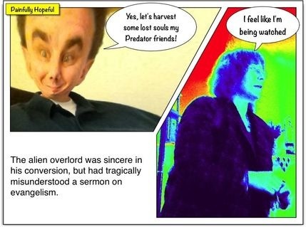 Christians often mean well, but we are often so immersed in our world and our lingo that we fail to see how we are being perceived by the people we are attempting to communicate with. This comic is memorial to all the tragic misunderstandings we Christians have caused over the years.