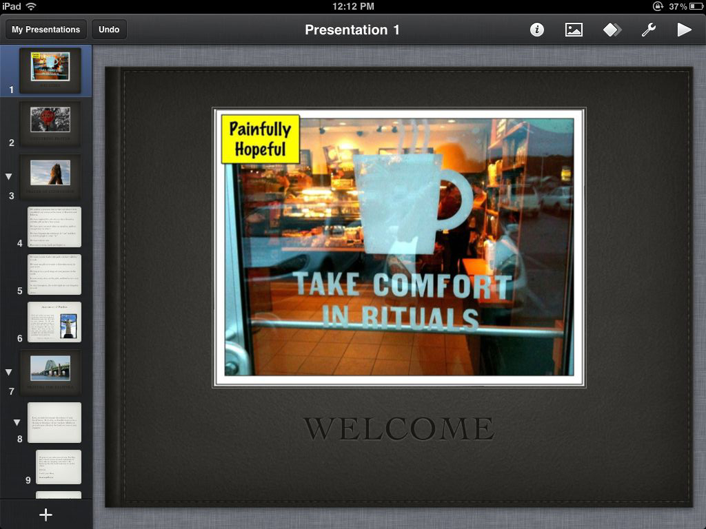 I am also a geek, so I thought that a prayer-meeting would be a wonderful time to test developing some slides entirely on my iPad using Keynote. Here’s my experience.