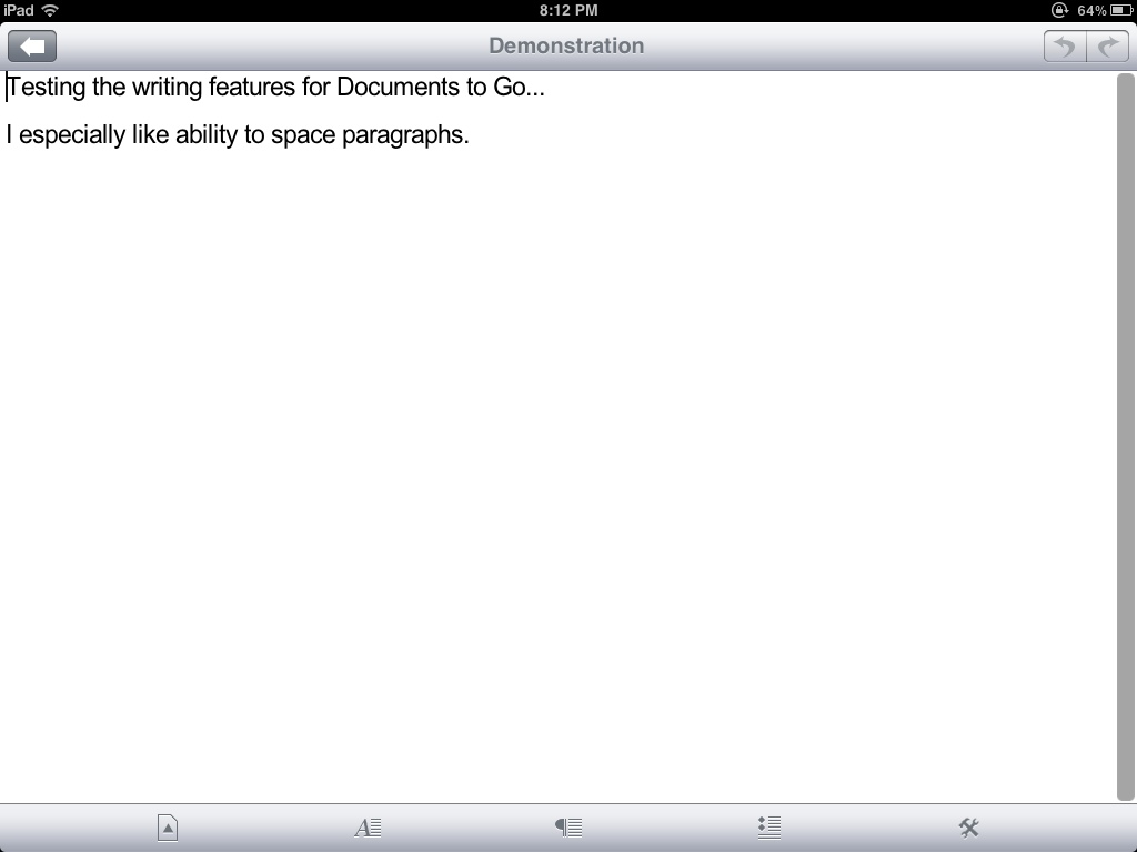 Documents to Go places it buttons at the bottom of the editor. This is likely a carry-over from the iPhone UI, where bottom buttons are easier to reach while typing, but it translates well on to the larger screen. There are five buttons in this row – file options, text formatting, paragraph formatting, lists, and tools. Each button tap reveals a list of common options for that category, along with a “more” option to access more complex formatting. The buttons, however, are not persistent and actually disappear when the on-screen keyboard is active. Again, this is likely a by-product of the suite being a universal app. Hiding the buttons when typing makes some sense when using a smaller screen, but on the iPad the vanishing act gets frustrating.
