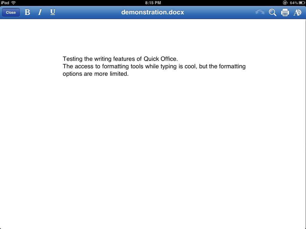 Quick office also displays it’s content in a page-layout format – allowing a content creator to see how their content will look when printed or exported to a PDF. This can be a useful feature in some instances, but it ends up wasting most of the iPad’s screen real-estate with an exciting display of document margins.