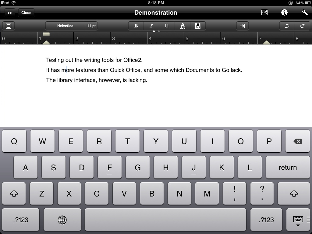 Quick Office attempts to create a fast, minimalist, interface while laying out content with a metaphor common to a desktop suite (page view). In the end it ends up failing in both button layout and content layout. Office2 HD has a complex, and cramped, interface. It does, however, have two views for content – allowing a user to view content in a way which makes sense on an iPad’s screen. Documents to Go manages to split the difference and uses a simple button layout and has no page view option at all. While Documents to Go has some quirks, mostly due to it’s universal nature, it’s still the best editor layout among the three suites.