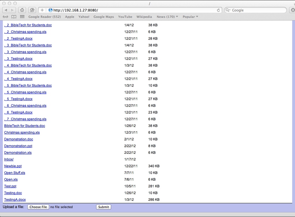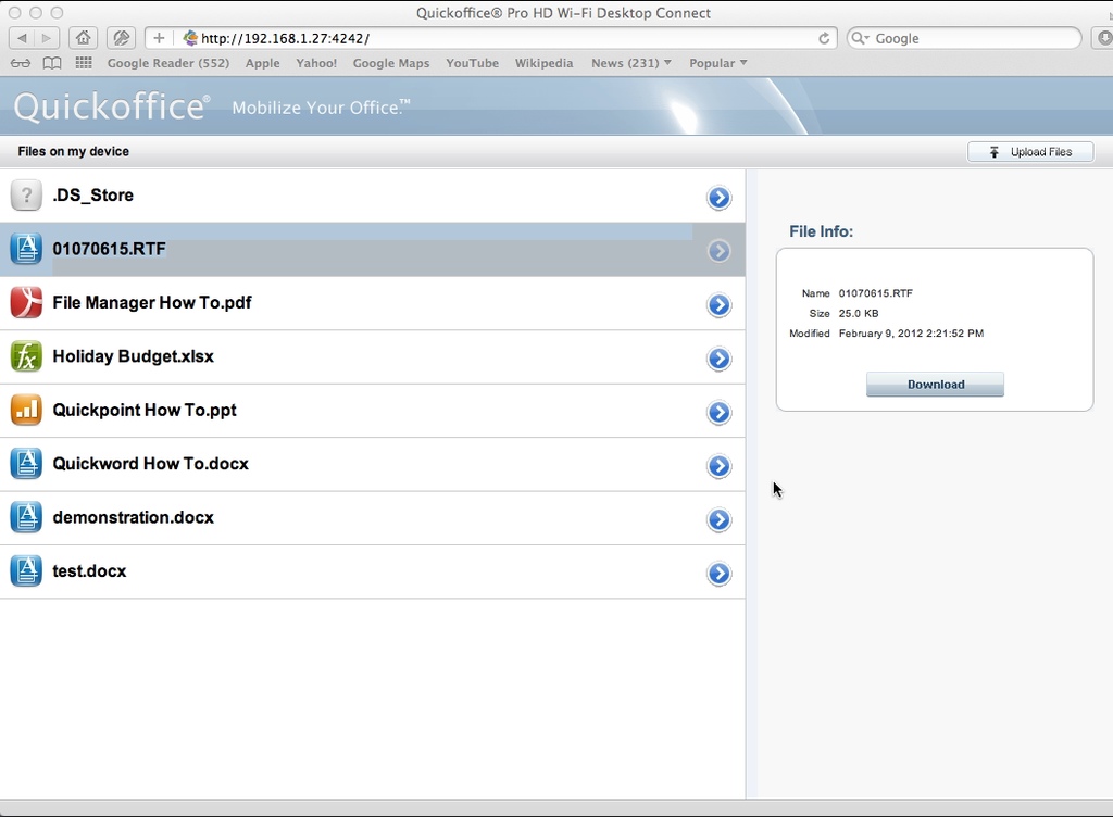 As with Quick Office, HD Office2 HD has a built-in file transfer option. This can be access by tapping the gear button in the lower left of the file management screen and toggling “Enable File Sharing.” Similarly, security can also be enabled for this feature. While Quick Office has a colorful and well-thought out web interface, Office2 HD brings up a plain list hyper-links with an upload button at the bottom of the page (which you will probably need to scroll down to reveal). It gets the job done, but it’s not fun to look at. If you are using the file transfer option for this suite connecting via the finder or windows explorer is a better option.