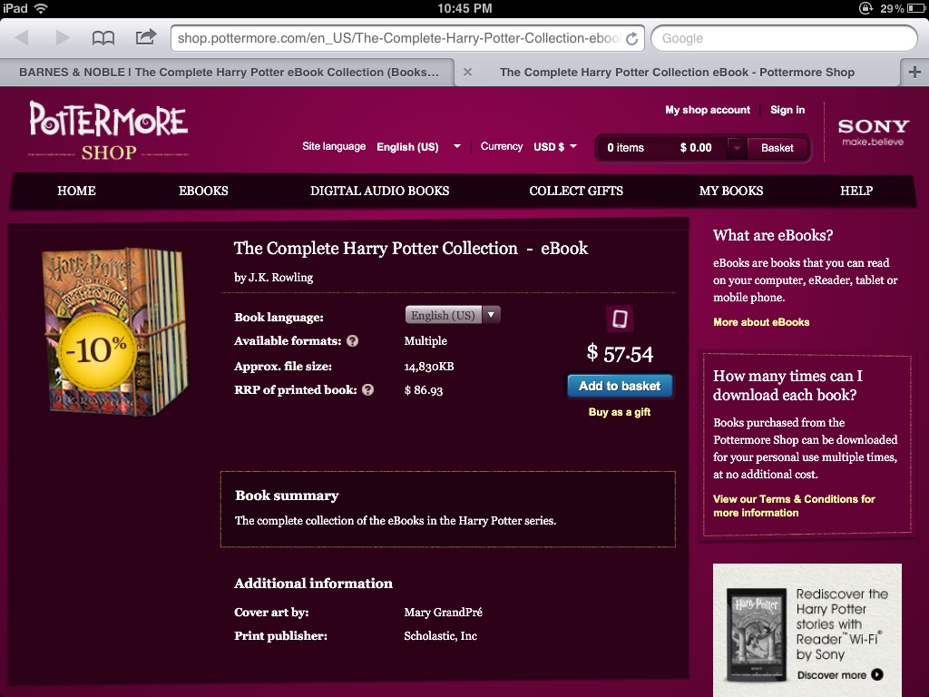 What JK Rowling has done with Pottermore is break vendor lock-in. When you purchase the books through the site you may link it to your Barnes and Noble or Amazon accounts and wireless receive your books as normal. You may also download the file and use Adobe digital editions to load the book on to any device compatible with that software. Finally, the file can be dropped into the books section of iTunes and synced with iBooks. You can download each book eight times (as far as I can tell, the Kindle and Nook links each count as one download). Additionally, the Pottermore store encourages parents to download the books and put them on any devices their children use for reading without purchasing another copy. They do state that they expect parents to get their children to purchase their own copies once they are 18 – but that’s it. They don’t use a draconian “age check” lock-down, they don’t tell you to choose your reading device wisely because you’ll always be tied to it, they don’t treat their customers like criminals waiting to pirate their books.