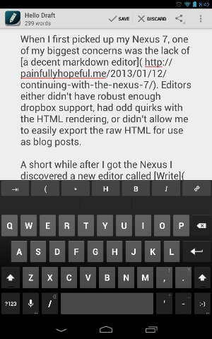 When I first picked up my Nexus 7, one of my biggest concerns was the lack of a decent markdown editor. Editors either didn’t have robust enough dropbox support, had odd quirks with the HTML rendering, or didn’t allow me to easily export the raw HTML for use as blog posts.
