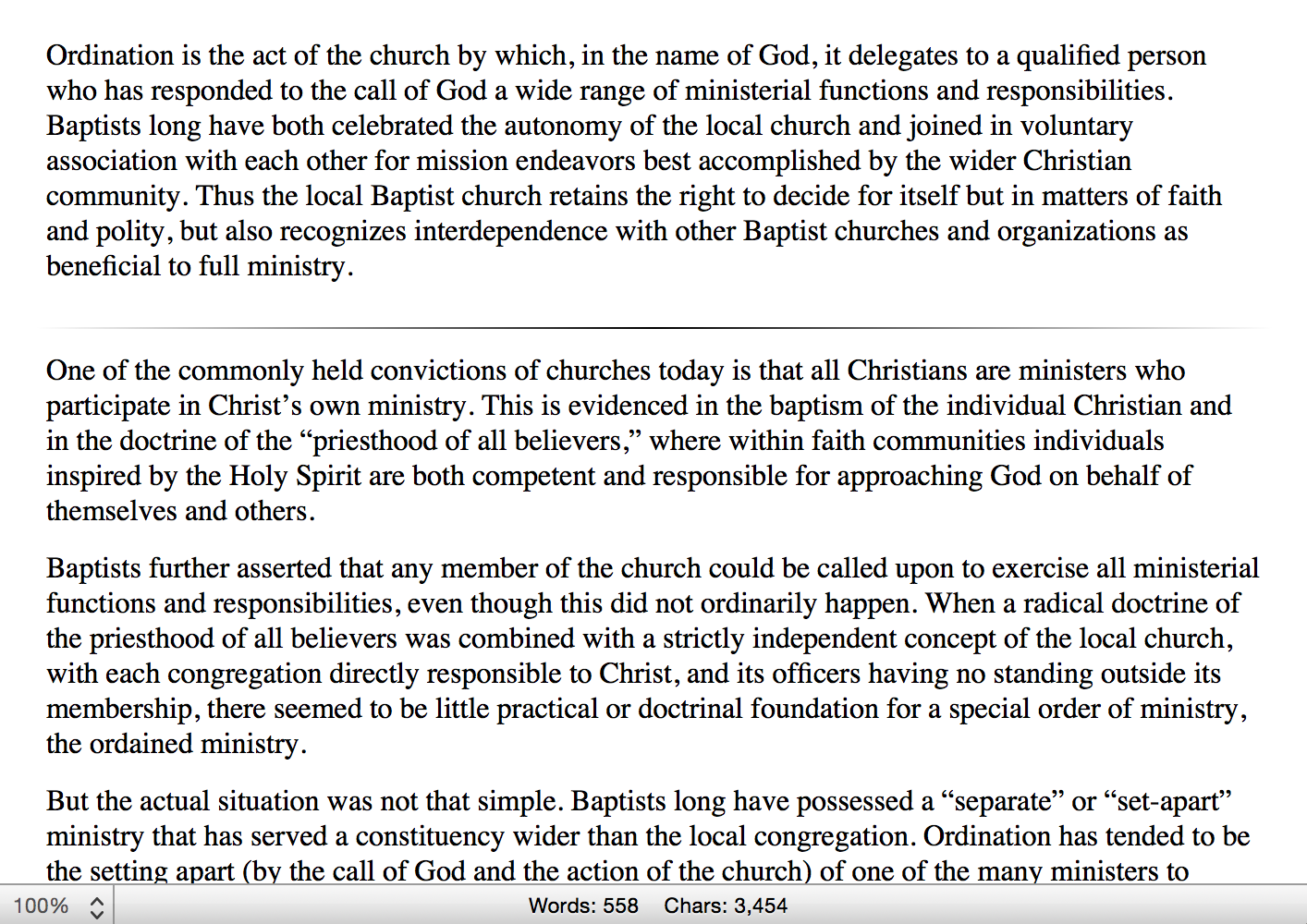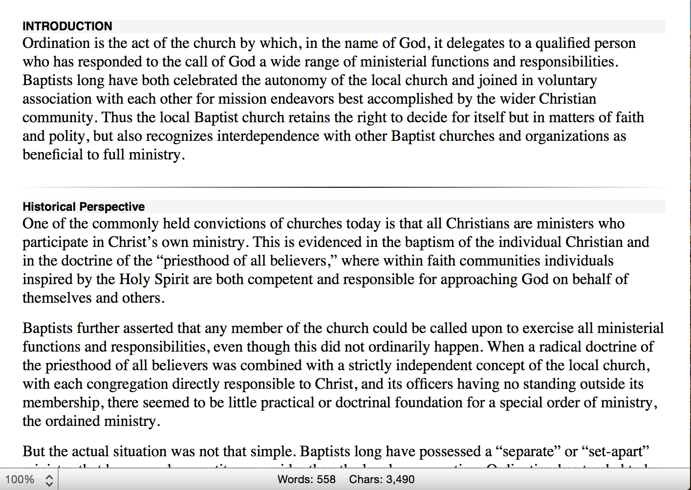 This often trips up people not used to this idea. They become confused switching their eyes back and forth from the binder to the editor, trying to remember what section they are dealing with. When the document outline is set before writing begins, it’s especially troublesome to remember what comes next. I solve this problem in two steps. First, I set the editor to display in “Scrivenings.” That is, all the documents beneath the selected layer will display as a single document in the editor. This is reflected in the editor window as depicted below.