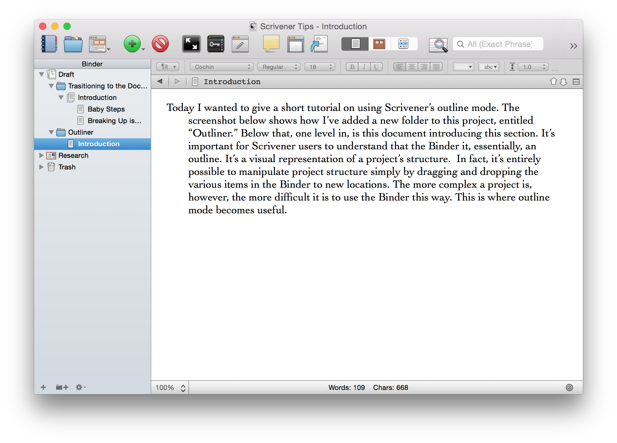 Using the outliner is a wonderful way to keep Scrivener projects organized. As with any new tool, the key to using it well is practice.