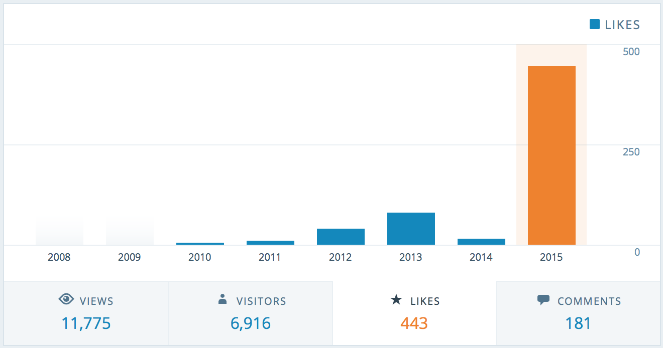 As it turns out, the only data point in my WordPress stats which has been consistently above previous years is the number of “likes” I receive. These come mainly from people who have stumbled on to a post and found in engaging enough to affirm. Many who like posts have subscribed to this feed and have come back to like follow up entries. I used to be confused when I received a “[so and so] likes [post]” email in my inbox. Being an introvert, I have a rather tight circle of friends – so being “liked” by strangers was on the other side of my social comprehension. Now I accept them as the signals of engagement they are, and have formed a genuine appreciation for every “like” a post receives 4.