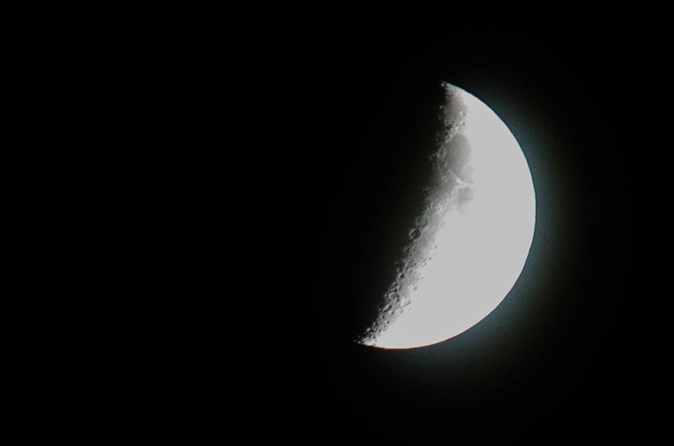Now that I have a DLSR I have been meaning to get out on a night when the moon is closers to crescent or quarter so I can bring out some of the Moon’s surface features along the terminator. Friday night my friend convinced me to go out, even though it was very hazy, and I’m glad I did! Most of the images weren’t all that much to write home about, and they all needed to be processed pretty heavily in Lightroom to combat the haze, but I am pleased with the results. For the first time since I was in college, I’ve taken photographs in which I can make out some actual features on the Moon.