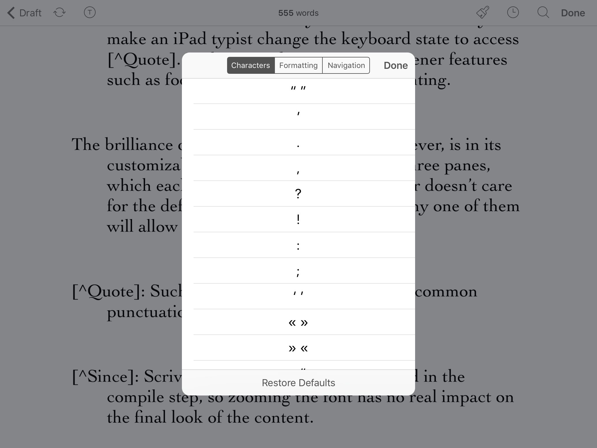 The brilliance of this extended keyboard, however, is in its customizability. The extra row contains three panes, each of which contains eight buttons. If a user doesn’t care for the default options, a long press on any one of these buttons will allow it to be re-mapped. I quickly set up a pane with several characters commonly used in Markdown. This customizability is extensive, but not complete. I couldn’t assign a button to the upward-pointing caret, needed to create MultiMarkdown footnotes, for example. Still, I can almost create a full Markdown keyboard in iOS Scrivener. It’s an amazing feature.