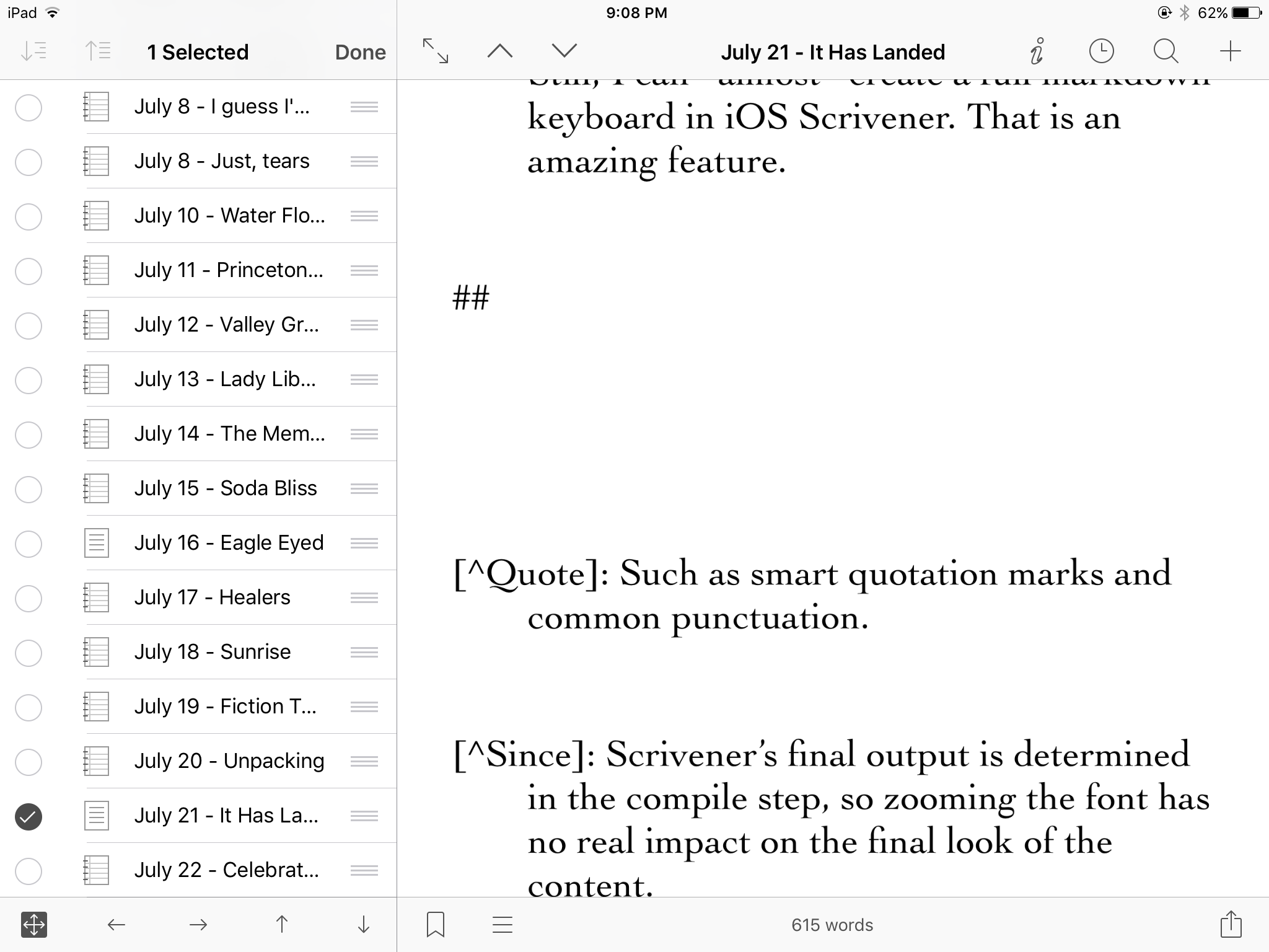 As with many other text editing tools, Scrivener includes an extended keyboard row by default. This extra row of buttons contains several keystrokes which normally make an iPad typist change the keyboard state to access 2. It also provides access to Scrivener features such as footnotes, comments, and highlighting.