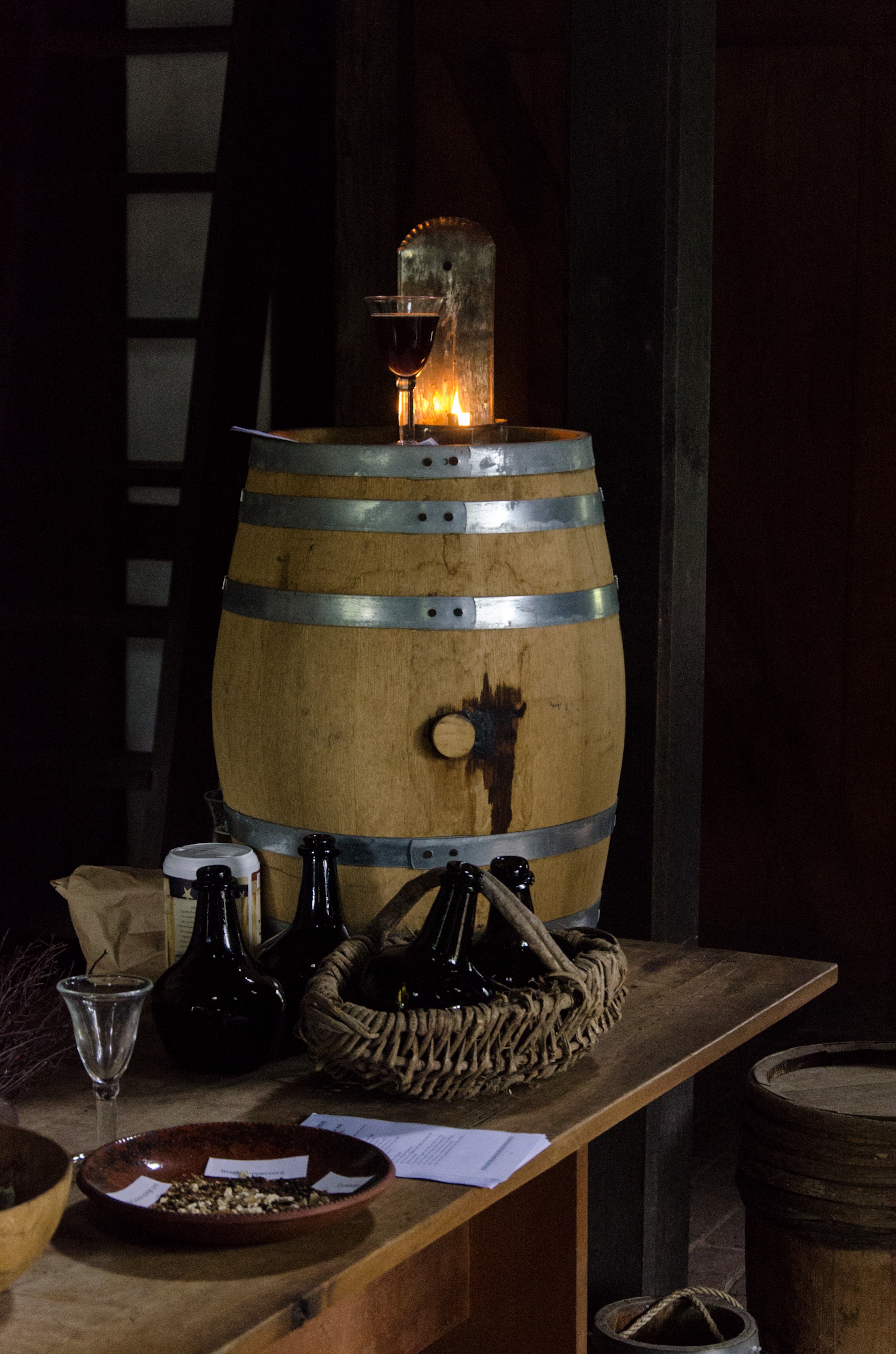 The image below is perhaps my favorite of those I took during the program. The light hit the wooden keg beautifully, and the glass bottles added to the depth.