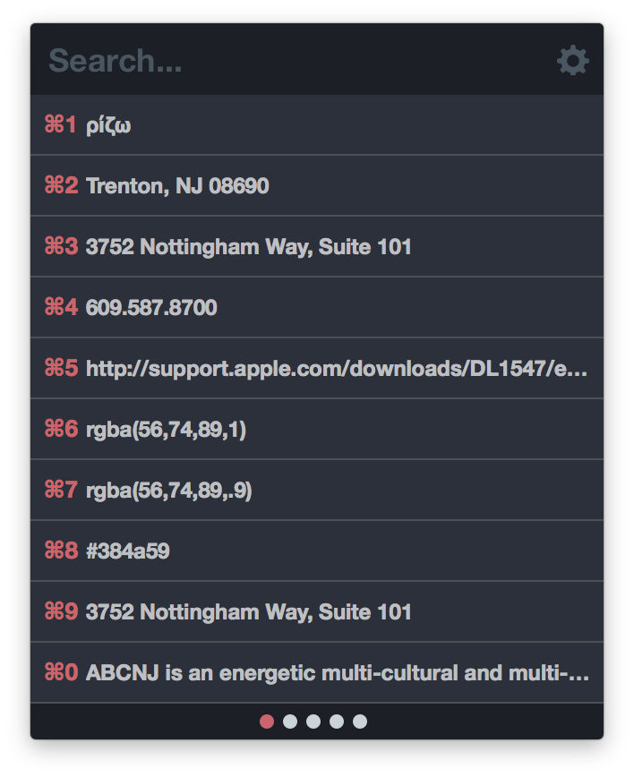 Second, it has a keyboard shortcut to activate the buffer view. I set my shortcut up with the same keystroke I’d previously set in jumpcut, so my muscle memory is happy, but the workflow is different. By default CopyClip 2 doesn’t automatically paste a selected clip into an open application. Rather, it’s keystroke opens a window with the ten most recent entries copied, identified with a shortcut key to select each individual clip. Once selected, “command-v” will paste that clip into the active application. There is an option to paste a selected clip into an application directly, but I’ve found a few of my most used apps don’t like to play nice when it’s activated 3. It’s one more stroke to paste, but the window view is actually more efficient then jumpcut’s workflow, so it’s a wash.