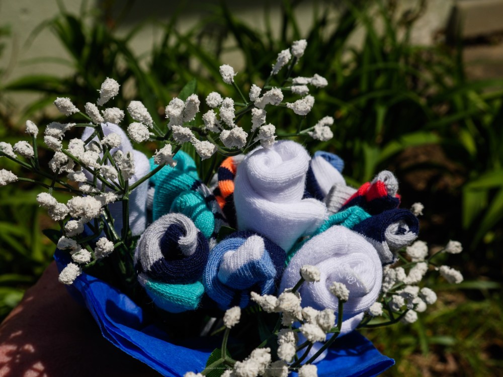 My wife’s class held a surprise shower for my wife this past week, and I wanted to share an image of the gift her co-teacher made. It’s bouquet of “flowers,” made of baby socks. It was so neat my wife determined to keep it “as is.”