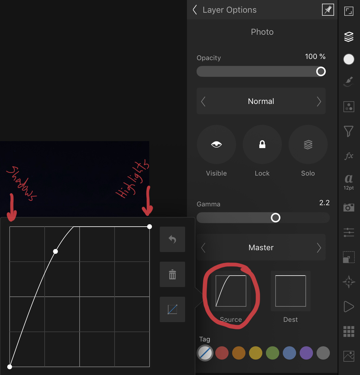I suppose I could use a blend mode like Screen, but that tends to leave traces of the background visible. Instead, I select my firework image layer and open up the layer options panel in Affinity Photo. Near the bottom of this panel are two options, “source” and “destination.” As I’m dealing with my source layer, I choose “source.” This brings up a curves-looking dialog which I manipulate as the below image shows.