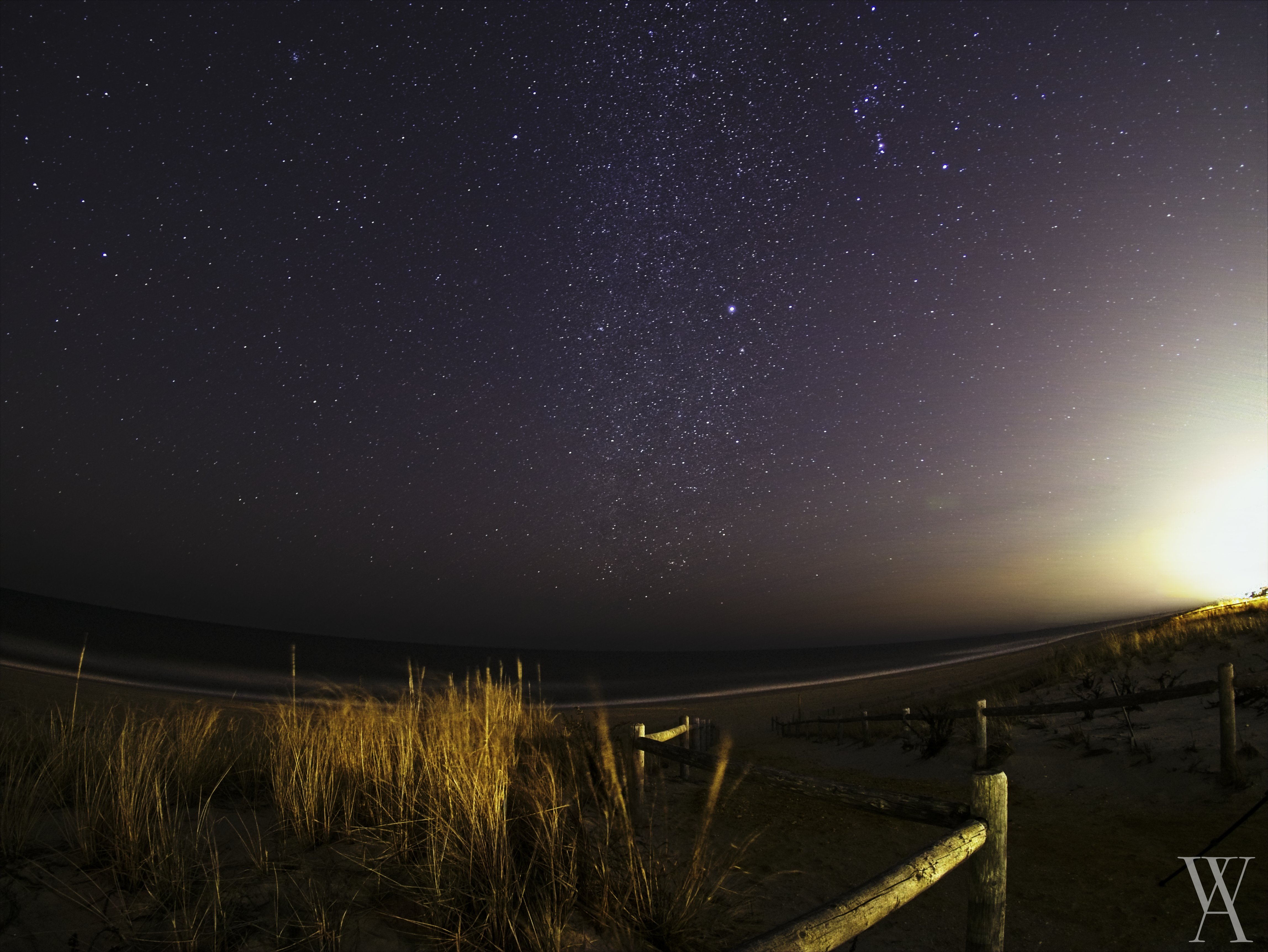 This past Friday my neighbor and I travelled to Long Beach Island (LBI) to try our hand at some astrophotography. I’d dabbled a bit during a recent pastor’s retreat, and wanted to get back to do a better job taking my exposures. LBI is a little over an hour away from where we live, so it didn’t take us very long to get on to the island. We then drove north to Harvey Cedars, where I knew there were fewer occupied houses. We found an ideal block and ascended the dune path to set up our equipment. The sky was stunning, but we did have one house that was lit up with floodlights, and that blew out a rather large portion of the sky. If I did this all over again, I would have continued to check for a block which had no illuminated houses. They are terrible–and during the summer, when the island is full, I can’t imagine these sorts of photos would be possible.