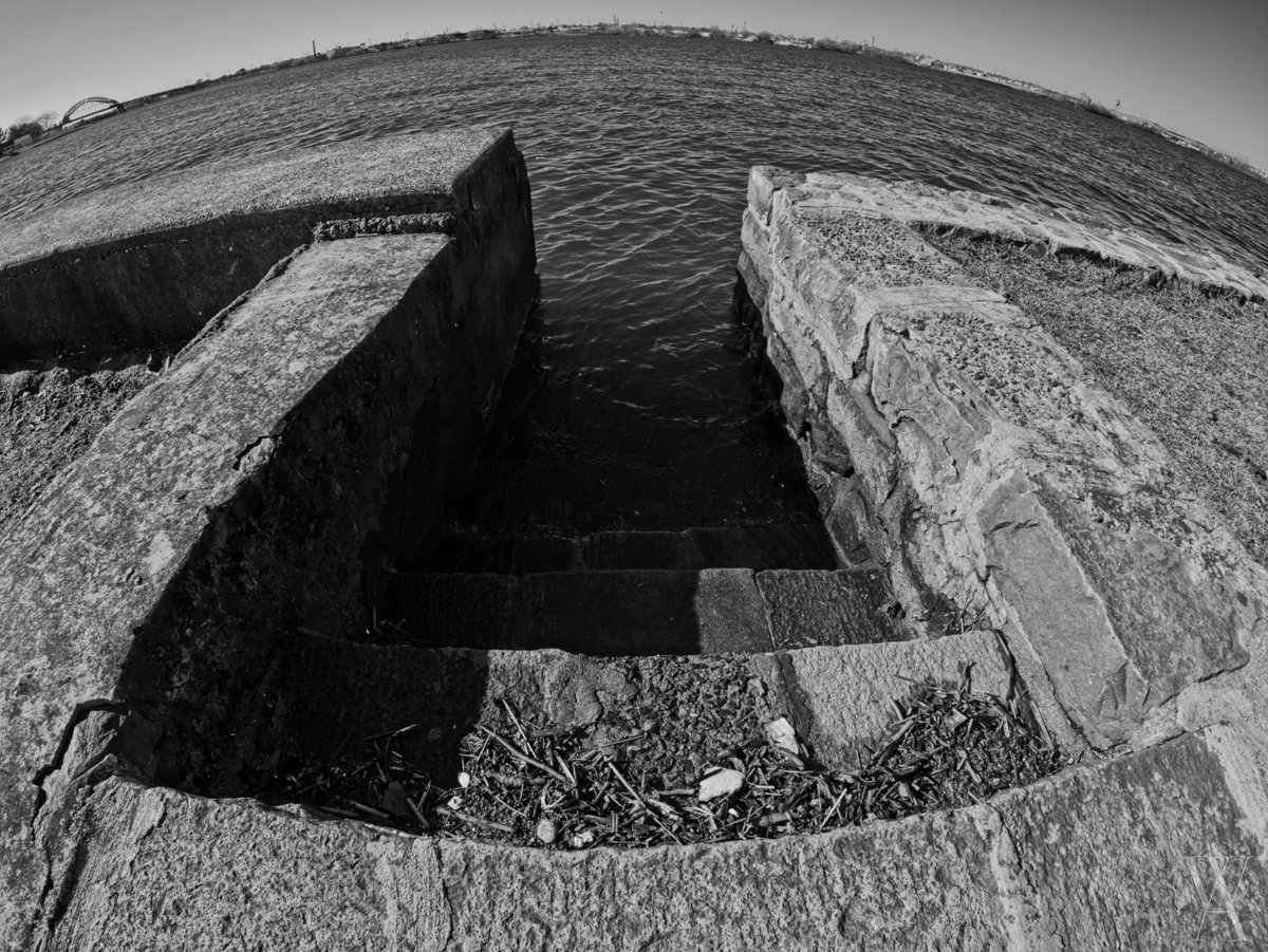 I’ve attempted to photograph these steps on a number of occasions, but I’ve never had a lens wide enough to do justice to the scene. At 7.5 mm, however, the fisheye allows me to capture the whole set of stairs, as well as Delaware River and Tacony-Palmyra Bridge. The lens distortion at this angle adds to its charm. I developed the photo in color, and then added a black and white filter. I love how it turned out.