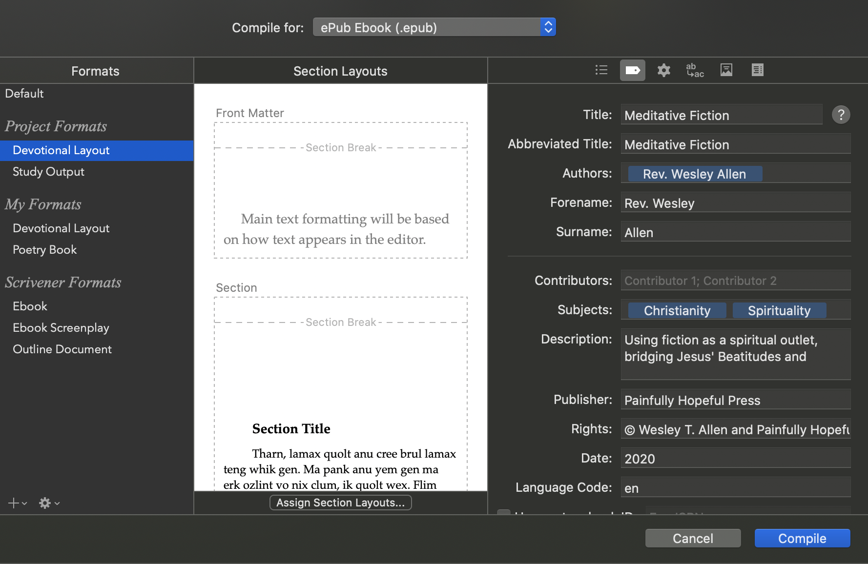 After writing, organizing, and editing your material 5 click on the “compile” button or navigate to the File==>Compile menu 6. Select “ePub eBook” as your compile option and then “Default” or “eBook” as your format. At this point, you may see a warning that some of your section types have not be assigned to Layouts, this is where things begin to get tricky.