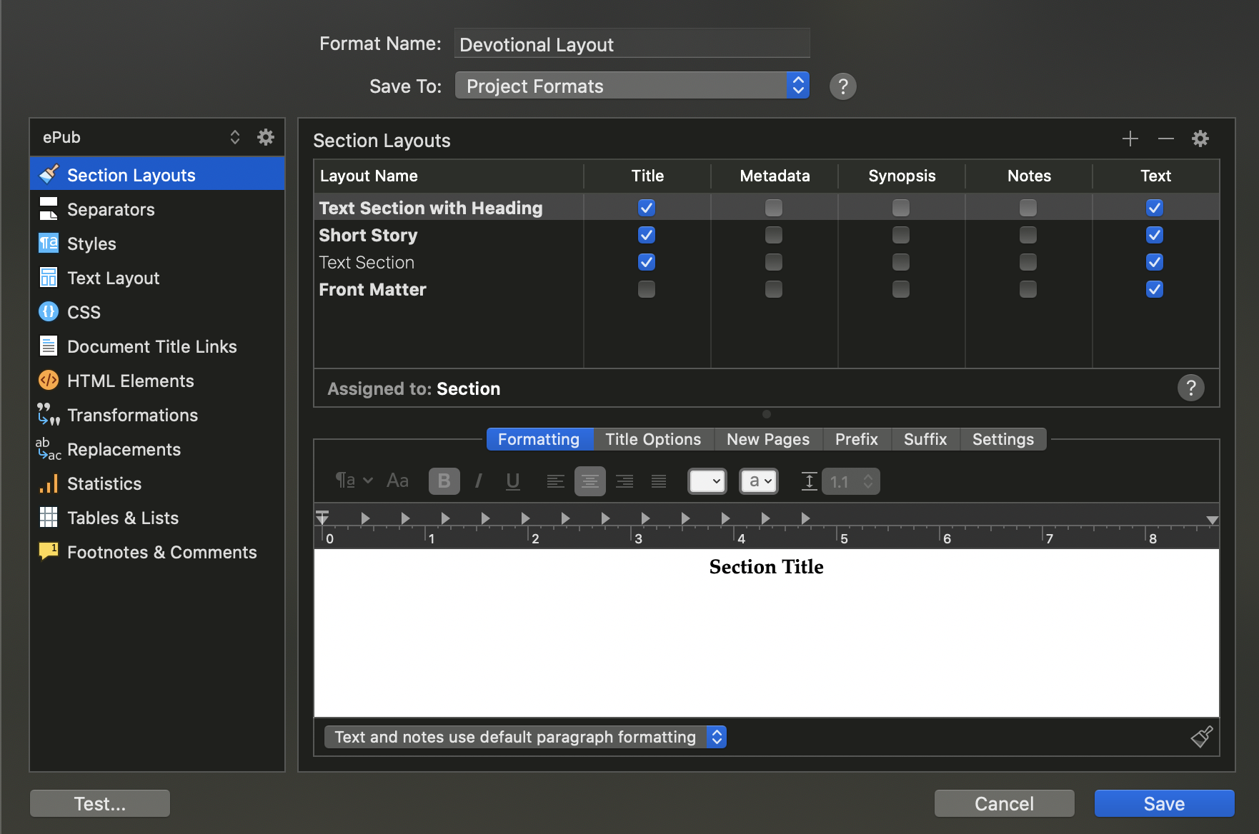 To get your eBook to look they way you want, each of your section types has to be linked to a layout that’s part of your compile format. The problem is, the default formats will include a large number of layouts which you may not need, many of which can look similar if you aren’t paying attention. At this point, click “Assign Section Layouts…” and then select a section layout for each section type in your project. Try to assign a layout which looks almost like you want it to appear in your output. You can then edit these layouts and customize it for your needs.